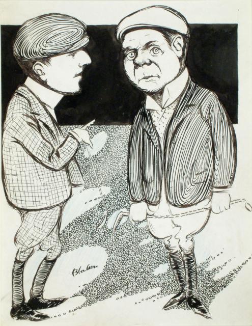 The early life drawings bear the labels of the South Kensington School System Examining Board and were probably made around 1895. They are executed in the traditional academic manner and attest to the fashion for charcoal on a laid Michallet paper. The ink pen illustrations suggest that Blaker once attempted to make a living from his work. Judging by the inscriptions, they were intended for publication. Stylistically they vary from the sketchy manner of George du Maurier and Charles Keene for Punch magazine to more consciously arranged areas of black and white recalling the artworks of Charles Robinson and the Edwardian gift Book illustrators.