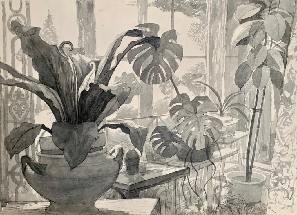 In the 1970s, John Elwyn returned to painting still-life: vases of flowers, potted plants on the windowsill, and on his wife’s Steinway piano with its elaborate fret-work music stand.